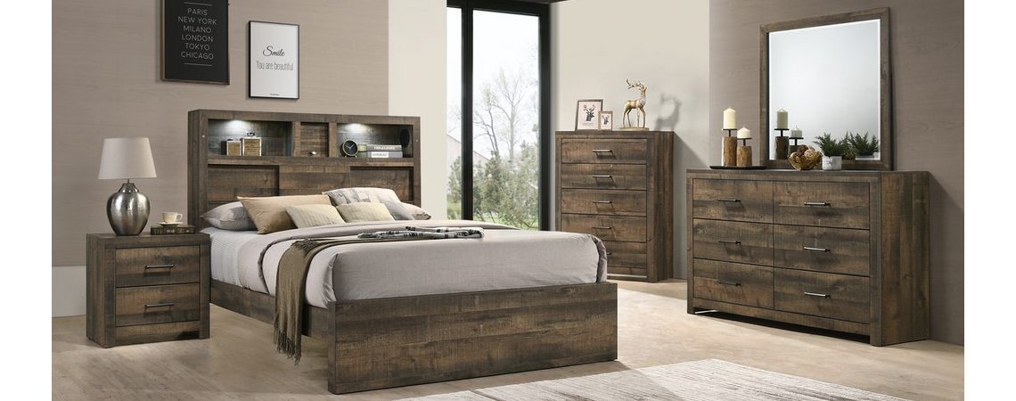 Solid wood framing with veneer . Wood knots and wood grain design on surface . Warm walnut finish . Sleek and modern design . Brushed bronze hardware . Low-profile bed height . Lighting in headboard . Bluetooth speakers in headboard head board contains soft touch lights USB charging and a Bluetooth music systemRead More