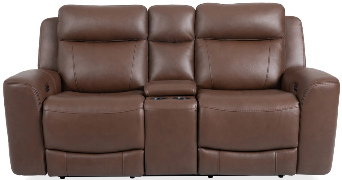 Loveseat console features two stainless steel cupholders and a hidden storage compartment which includes a power center with one USB/USB-C port and one 110 volt charger