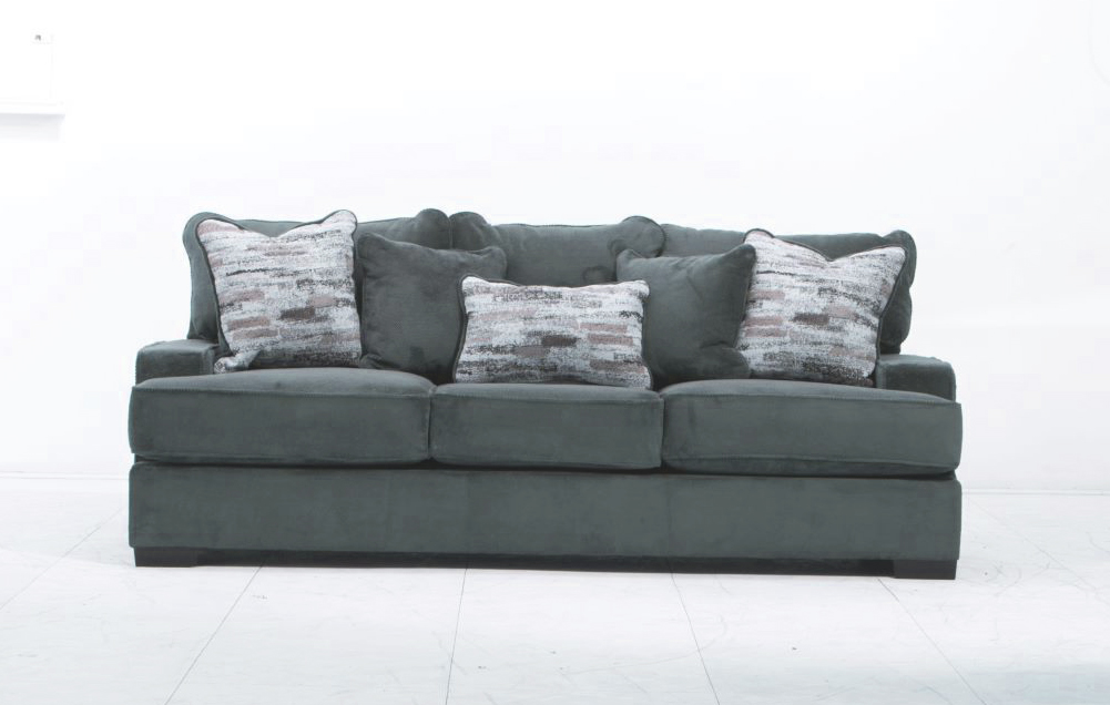 The Falcon Cooper Sterling Sofa includes spacious padding, sterling-gray upholstery, and dynamic style clean lines. For comfort, cushions have gel-infused covers. Features 4 pillows in gray and white styles and a pillow in the lumbar.
