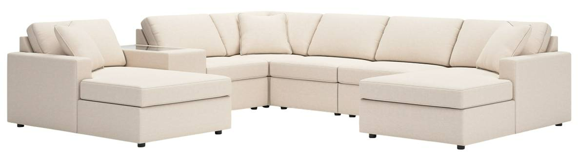 Includes 7 Modular Pieces: Left-arm facing corner chaise, console with storage, wedge, right-arm facing corner chaise, and 3 armless chairs