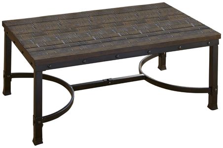 The Ambrose collection features a butcher block style wood surface that gives an aged and antiqued look. The rustic styling is accentuated by the dark iron legs and Demilune stretchers that connect in the middle. The distressed finish of the Ambrose cocktail table will easily blend with existing décor.Read More